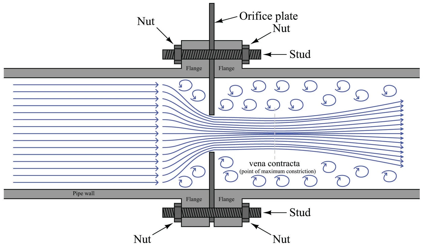 Downstream of a sharp-edged orifice, the jet contracts due to streamline curvature, forming a vena contracta (Figure 4.2). The vena contracta refers to the narrowest cross-section of a fluid jet shortly downstream of an orifice or nozzle, where the streamlines converge, resulting in the smallest area, maximum velocity, and minimum pressure.